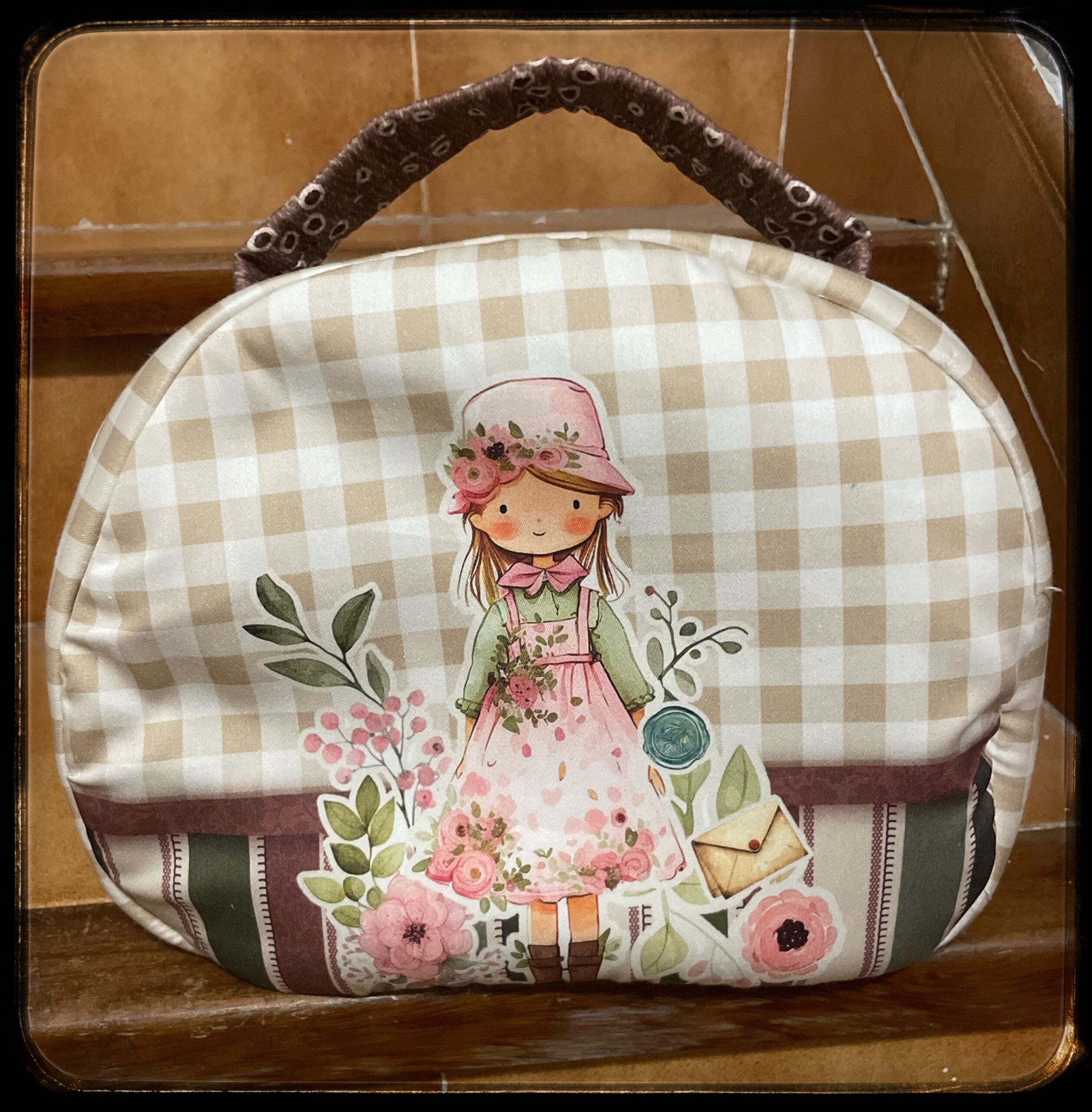 Panel de niña flor donde podras sacr un bonito neceser o costurero o si pones aislante termico podra ser ru neverita para llevar tu comidas….
